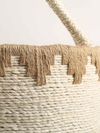 Upgrade your storage with this handcrafted jute bin. Its natural fibers boast a crisp white body adorned with a playful tan geometric pattern near the edge. This bin offers a stylish and practical storage solution.