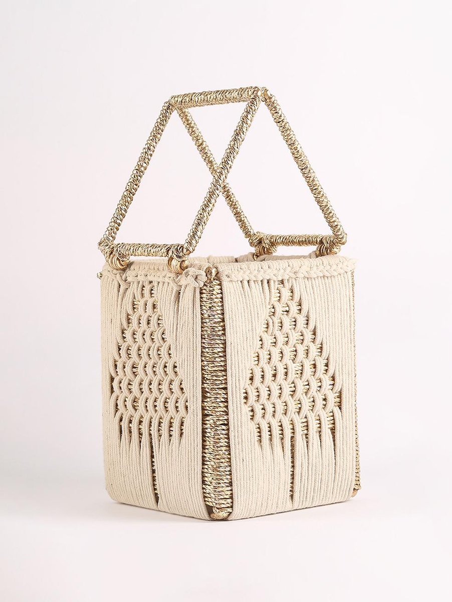 Make festive gifting eco-friendly yet sophisticated with this basket crafted from natural and upcycled yarns. Adorned with a handwoven Christmas tree motif in the center, this gift basket in off-white and gold is a celebration of elegance and thoughtfulness.